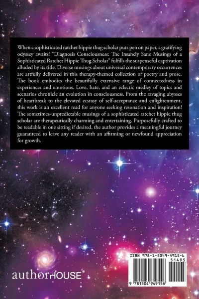 When a sophisticated ratchet hippie thug scholar puts pen on paper, a gratifying odyssey awaits! "Diagnosis Consciousness: The Insanely Sane Musings of a Sophisticated Ratchet Hippie Thug Scholar" fulfills the suspenseful captivation alluded by its title. Diverse musings about universal contemporary occurrences are artfully delivered in this therapy-themed collection of poetry and prose. The book embodies the beautifully extensive range of connectedness in experiences and emotions. Love, hate, and an eclectic medley of topics and scenarios chronicle an evolution in consciousness. From the ravaging abysses of heartbreak to the elevated ecstasy of self-acceptance and enlightenment, this work is an excellent read for anyone seeking resonation and inspiration! The sometimes-unpredictable musings of a sophisticated ratchet hippie thug scholar are therapeutically charming and entertaining. Purposefully crafted to be readable in one sitting if desired, the author provides a meaningful journey guaranteed to leave any reader with an affirming or newfound appreciation for growth.