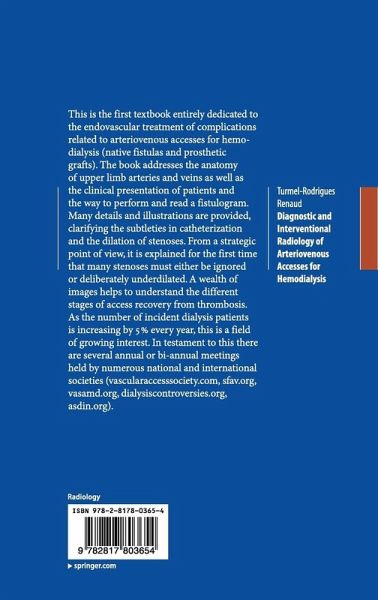 This is the first textbook entirely dedicated to the endovascular treatment of complications related to arteriovenous accesses for hemodialysis (native fistulas and prosthetic grafts). The book addresses the anatomy of upper limb arteries and veins as well as the clinical presentation of patients and the way to perform and read a fistulogram. Many details and illustrations are provided, clarifying the subtleties in catheterization and the dilation of stenoses. From a strategic point of view, it is explained for the first time that many stenoses must either be ignored or deliberately underdilated. A wealth of images helps to understand the different stages of access recovery from thrombosis. As the number of incident dialysis patients is increasing by 5% every year, this is a field of growing interest. In testament to this there are several annual or bi-annual meetings held by numerous national and international societies (vascularaccesssociety.com, sfav.org, vasamd.org, dialysiscontroversies.org, asdin.org).