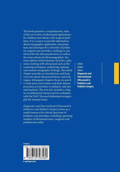 Introduction.- Pediatric Spinal Sonography.- Surgical Ultrasound of the Pediatric Head and Neck.- The Thorax.- The Liver.- The Biliary Tract.- The Pancreas.- The Spleen.- Abdominal Vessels.- Gastrointestinal Tract.- Intra-abdominal and Retroperitoneal Masses.- Emergency Ultrasound in the Evaluation of Pediatric Blunt Abdominal Trauma.- The Kidney.- Adrenal Gland.- The Pediatric Pelvis.- Groin and Testicle.- Contrast-enhanced Ultrasound (CEUS) for Children.- Ultrasound-Guided Vascular Access.- Core Biopsy of Masses and Solid Organs.- Fine Needle Aspiration (FNA) of the Thyroid Gland.- Diagnostic and Therapeutic Drainage.- Sclerotherapy of Vascular Malformations.- Regional Blocks for Postoperative Pain Control.- An Introduction to Intraoperative Ultrasound.