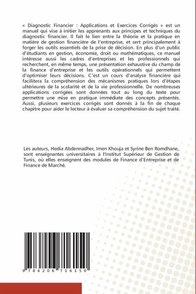 « Diagnostic Financier : Applications et Exercices Corrigés » est un manuel qui vise à initier les apprenants aux principes et techniques du diagnostic financier. Il fait le lien entre la théorie et la pratique en matière de gestion financière de l'entreprise, et sert principalement à forger les outils essentiels de la prise de décision. En plus d'un public d'étudiants en gestion, économie, droit ou mathématiques, ce manuel intéresse aussi les cadres d'entreprises et les professionnels qui recherchent, en même temps, une présentation exhaustive du champ de la finance d'entreprise et les outils opérationnels qui permettent d'optimiser leurs décisions. C'est un cours d'analyse financière qui facilitera la compréhension des mécanismes pratiques lors d'étapes ultérieures de la scolarité et de la vie professionnelle. De nombreuses applications corrigées sont données tout au long du texte pour permettre une mise en pratique immédiate des concepts présentés. Aussi, plusieurs exercices corrigés sont donnés à la fin de chaque chapitre pour aider le lecteur à évaluer sa compréhension du sujet traité.
