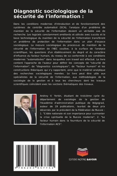 Dans les conditions modernes d'introduction et de fonctionnement des systèmes de contrôle automatisé (SCA), l'analyse d'un problème de maintien de la sécurité de l'information devient un véritable axe de recherche. Les logiciels constamment améliorés et utilisés avec succès et la base technologique du maintien de la sécurité de l'information transfèrent un problème de protection de l'information dans un plan d'espace sociologique. La mesure sociologique du processus de maintien de la sécurité de l'information de l'AEC soulève, à la surface de l'analyse scientifique, les questions d'un établissement du degré et du caractère d'influence du facteur humain, du niveau de sa conformité à ces conditions modernes "automatisées" dans lesquelles son travail est effectué. Le livre contient l'approche de l'auteur pour définir les concepts de "sécurité de l'information", de "diagnostics sociologiques", de "facteur humain" et les constructions théoriques qui s'y rapportent, ainsi que le matériel analytique des recherches sociologiques menées. Le livre peut être utile aux spécialistes de la sécurité de l'information, aux méthodologies de la sociologie de la gestion et à tous les chercheurs dont les travaux scientifiques coïncident avec les sections thématiques des travaux.
