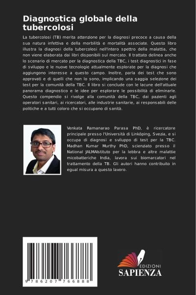 La tubercolosi (TB) merita attenzione per la diagnosi precoce a causa della sua natura infettiva e della morbilità e mortalità associate. Questo libro illustra la diagnosi della tubercolosi nell'intero spettro della malattia, che non viene elaborata dai libri disponibili sul mercato. Il trattato delinea anche lo scenario di mercato per la diagnostica della TBC, i test diagnostici in fase di sviluppo e le nuove tecnologie attualmente esplorate per la diagnosi che aggiungono interesse a questo campo. Inoltre, parla dei test che sono approvati e di quelli che non lo sono, implicando una saggia selezione dei test per la comunità della TBC. Il libro si conclude con le lacune dell'attuale panorama diagnostico e le idee per esplorare le possibilità di eliminarle. Questo compendio si rivolge alla comunità della TBC, dai pazienti agli operatori sanitari, ai ricercatori, alle industrie sanitarie, ai responsabili delle politiche e a tutti coloro che si occupano di sanità.