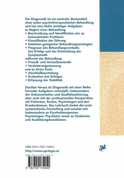 Das Buch ist als Lehrbuch konzipiert. Die einzelnen Beiträge wurden von international anerkannten Fachleuten geschrieben. Es beinhaltet in dieser Breite die erste systematische Darstellung der Diagnostik in der Psychotherapie und wendet sich insbesondere an Psychotherapeuten, Psychologen, Psychiater sowie an Studenten und Ausbildungskandidaten.