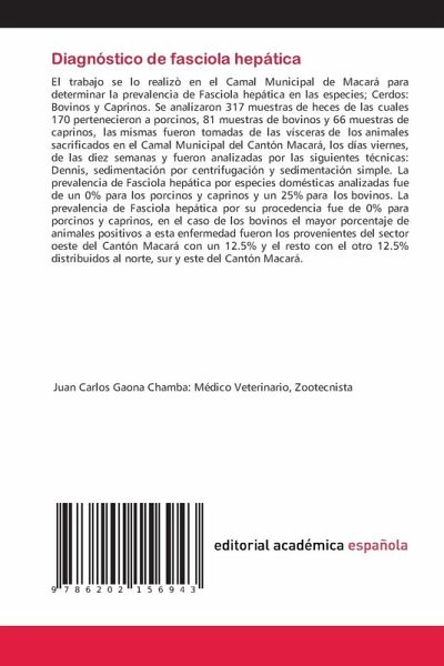 El trabajo se lo realizò en el Camal Municipal de Macará para determinar la prevalencia de Fasciola hepática en las especies; Cerdos: Bovinos y Caprinos. Se analizaron 317 muestras de heces de las cuales 170 pertenecieron a porcinos, 81 muestras de bovinos y 66 muestras de caprinos, las mismas fueron tomadas de las vísceras de los animales sacrificados en el Camal Municipal del Cantón Macará, los días viernes, de las diez semanas y fueron analizadas por las siguientes técnicas: Dennis, sedimentación por centrifugación y sedimentación simple. La prevalencia de Fasciola hepática por especies domésticas analizadas fue de un 0% para los porcinos y caprinos y un 25% para los bovinos. La prevalencia de Fasciola hepática por su procedencia fue de 0% para porcinos y caprinos, en el caso de los bovinos el mayor porcentaje de animales positivos a esta enfermedad fueron los provenientes del sector oeste del Cantón Macará con un 12.5% y el resto con el otro 12.5% distribuidos al norte, sur y este del Cantón Macará.
