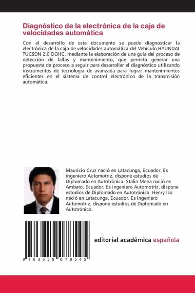 Con el desarrollo de este documento se puede diagnosticar la electrónica de la caja de velocidades automática del Vehículo HYUNDAI TUCSON 2.0 DOHC, mediante la elaboración de una guía del proceso de detección de fallas y mantenimiento, que permita generar una propuesta de proceso a seguir para desarrollar el diagnóstico utilizando instrumentos de tecnología de avanzada para lograr mantenimientos eficientes en el sistema de control electrónico de la transmisión automática.