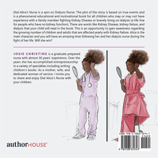 Dial Alice's Nurse is a spin on Dialysis Nurse. The plot of the story is based on true events and is a phenomenal educational and motivational book for all children who may or may not have experience with a family member fighting Kidney Disease or bravely living on dialysis (a life-line for people who have no kidney function). There are words like Kidney Disease, kidney failure, and dialysis that your child will read in the book. This is an opportunity to gain awareness regarding the growing number of children and adults that are affected yearly with Kidney Failure. Alice is the main character and you will have an amazing time following her and her dialysis nurse during the fight of her life. Will she win?