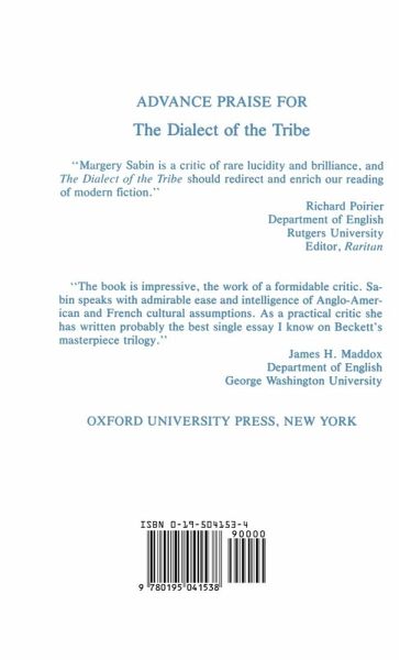 The bold careers of Henry James, D.H. Lawrence, James Joyce, and Samuel Beckett--writers with profoundly unsettled cultural identities--spark Margery Sabin's investigation of values carried through inherited forms of speech. The Dialect of the Tribe offers fresh readings of such great novels as The Golden Bowl, Women in Love, Ulysses, and the Beckett trilogy which illustrate how complex attitudes toward the speech forms of language inform the most varied social, psychological, and aesthetic structures in modern fiction. Sabin explores the powerful tension in these writers between appreciation for the resources of common speech in English and contrary longings for a freedom associated with abstraction, system, and foreign or private language. Her own critical procedures transcend restrictive and reductive polarizations, as she lucidly analyzes the biases of both the Anglo-American critical tradition and the challenge to that tradition in French literary theory and practice. Written in a jargon-free, accessible style, The Dialect of the Tribe argues that the ambiguous cultural positions of the great modern novelists in English emerge as a major source of their strength--the rich traditions of the English language give enlivening power to writers also remarkable for their drive toward radical independence and skepticism.