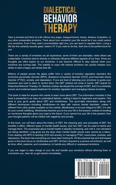 If you've always wanted to understand and manage your intense emotions and really want them to get the best out of you, then keep reading... Are you sick and tired of allowing your emotions to regulate your life? Have you tried endless other solutions, but nothing seems to work for more than a few weeks? Perhaps you have tried avoiding your emotions, thinking it will give you the ability to regulate them. Do you finally want to say goodbye to impractical advice about avoiding or ignoring emotions and discover something that works for you? If so, then you've come to the right place. You see, managing and controlling intense emotions and dealing with behavioral disorders don't have to be difficult. In fact, it's easier than you think. Dialectical behavior therapy (DBT) was developed by Dr. Marsha Linehan and her colleagues to treat borderline personality disorder. DBT is a clinically tested and proven technique that can improve an individual's ability to manage mental or emotional disorders. The four simple principles DBT is based on include mindfulness, interpersonal effectiveness, distress tolerance, and regulation of emotions. This means you can effectively regulate intense emotions and reactions without compromising on the quality of life you wish to lead. Here's just a tiny fraction of what you'll discover:The meaning and history of DBT. The core principles of DBT. DBT and mindfulness. Tips to overcome OCD using DBT and mindfulness. DBT techniques to deal with anxiety and stress. Mindful tips to tackle panic attacks. Taming borderline personality disorder with DBT. And much, much more! Take a second to imagine how you'll feel once you can finally learn to constructively regulate your intense emotions and reactions, and how your family and friends will react when they see you leading a happier and healthier life. So, even if you're struggling to understand your emotions, or you use unhealthy coping mechanisms, you can finally learn to manage and overcome behavioral disorders and intense emotions by using the practical tips given in this book. And if you have a burning desire to regain control of your life and lead a life that's free from stress, anxiety, or depression, then scroll up and click "Add to Cart" now.