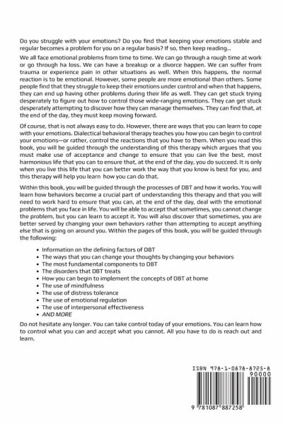 Do you struggle with your emotions? Do you find that keeping your emotions stable and regular becomes a problem for you on a regular basis? If so, then keep reading... We all face emotional problems from time to time. We can go through a rough time at work or go through ha loss. We can have a breakup or a divorce happen. We can suffer from trauma or experience pain in other situations as well. When this happens, the normal reaction is to be emotional. However, some people are more emotional than others. Some people find that they struggle to keep their emotions under control and when that happens, they can end up having other problems during their life as well. They can get stuck trying desperately to figure out how to control those wide-ranging emotions. They can get stuck desperately attempting to discover how they can manage themselves. They can find that, at the end of the day, they must keep moving forward. Of course, that is not always easy to do. However, there are ways that you can learn to cope with your emotions. Dialectical behavioral therapy teaches you how you can begin to control your emotions-or rather, control the reactions that you have to them. When you read this book, you will be guided through the understanding of this therapy which argues that you must make use of acceptance and change to ensure that you can live the best, most harmonious life that you can to ensure that, at the end of the day, you do succeed. It is only when you live this life that you can better work the way that you know is best for you, and this therapy will help you learn how you can do that. Within this book, you will be guided through the processes of DBT and how it works. You will learn how behaviors become a crucial part of understanding this therapy and that you will need to work hard to ensure that you can, at the end of the day, deal with the emotional problems that you face in life. You will be able to accept that sometimes, you cannot change the problem, but you can learn to accept it. You will also discover that sometimes, you are better served by changing your own behaviors rather than attempting to accept anything else that is going on around you.