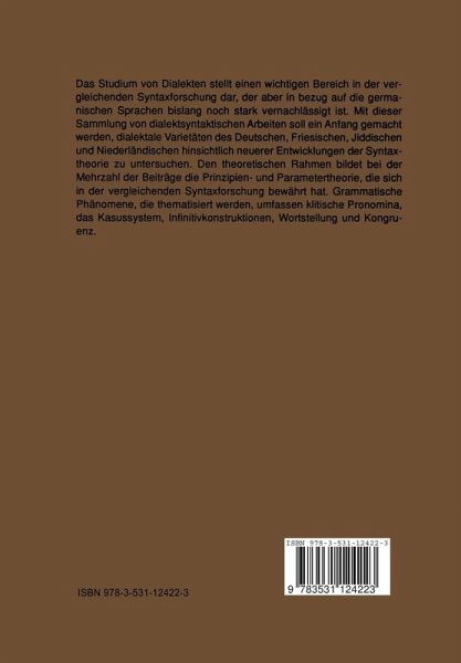 Das Studium von Dialekten stellt einen wichtigen Bereich in der vergleichenden Syntaxforschung dar, der aber in bezug auf die germanischen Sprachen bislang noch stark vernachlässigt ist. Mit dieser Sammlung von dialektsyntaktischen Arbeiten soll ein Anfang gemacht werden, dialektale Varietäten des Deutschen, Friesischen, Jiddischen und Niederländischen hinsichtlich neuerer Entwicklungen der Syntaxtheorie zu untersuchen. Den theoretischen Rahmen bildet bei der Mehrzahl der Beiträge die Prinzipien- und Parametertheorie, die sich in der vergleichenden Syntaxforschung bewährt hat. Grammatische Phänomene, die thematisiert werden, umfassen klitische Pronomina, das Kasussystem, Infinitivkonstruktionen, Wortstellung und Kongruenz.