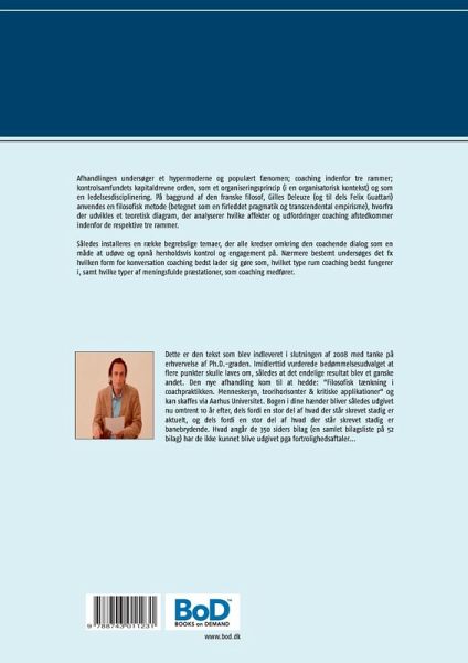 Afhandlingen undersøger et hypermoderne og populært fænomen; coaching indenfor tre rammer; kontrolsamfundets kapitaldrevne orden, som et organiseringsprincip (i en organisatorisk kontekst) og som en ledelsesdisciplinering. På baggrund af den franske filosof, Gilles Deleuze (og til dels Felix Guattari), anvendes en filosofisk metode (betegnet som en firleddet pragmatik og transcendental empirisme), hvorfra der udvikles et teoretisk diagram, der analyserer hvilke affekter og udfordringer coaching afstedkommer indenfor de respektive tre rammer.
