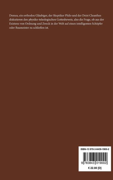 Demea, ein orthodox Gläubiger, der Skeptiker Philo und der Deist Cleanthes diskutieren den physiko-teleologischen Gottesbeweis, also die Frage, ob aus der Existenz von Ordnung und Zweck in der Welt auf einen intelligenten Schöpfer oder Baumeister zu schließen ist.
