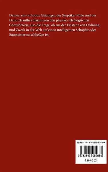 Demea, ein orthodox Gläubiger, der Skeptiker Philo und der Deist Cleanthes diskutieren den physiko-teleologischen Gottesbeweis, also die Frage, ob aus der Existenz von Ordnung und Zweck in der Welt auf einen intelligenten Schöpfer oder Baumeister zu schließen ist.