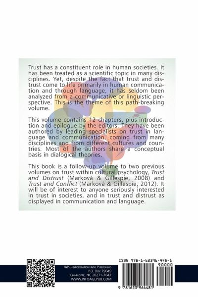 A volume in Advances in Cultural Psychology Series Editor: Jaan Valsiner, Clark University Trust has a constituent role in human societies. It has been treated as a scientific topic in many disciplines. Yet, despite the fact that trust and distrust come to life primarily in human communication and through language, it has seldom been analyzed from a communicative or linguistic perspective. This is the theme of this path-breaking volume. This volume contains 12 chapters, plus introduction and epilogue by the editors. They have been authored by leading specialists on trust in language and communication, coming from many disciplines and from different cultures and countries. Most of the authors share a conceptual basis in dialogical theories. This book is a follow-up volume to two previous volumes on trust within cultural psychology, Trust and Distrust (Marková & Gillespie, 2008) and Trust and Conflict (Marková & Gillespie, 2012). It will be of interest to anyone seriously interested in trust in societies, and in trust and distrust as displayed in communication and language.