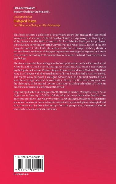 The first essay establishes a dialogue with Greek philosophers such as Parmenides and Aristotle. In the second essay this dialogue is established with semiotic-constructivist psychologists such as Jaan Valsiner, Ragnar Rommetveit and Ivana Marková. The third essay is a dialogue with the contributions of Ernst Boesch's symbolic action theory. The fourth essay proposes a dialogue between semiotic-cultural constructivists and Hans-Georg Gadamer's hermeneutics. Finally, the fifth essay proposes how the philosophy of Emmanuel Levinas contributes to dialogical studies of I-other in the context of semiotic-cultural constructivism.