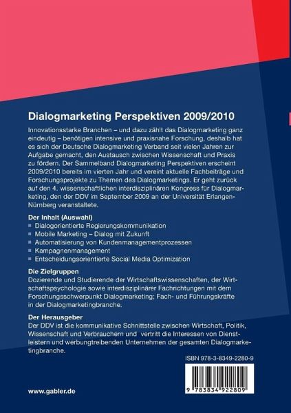 Der Sammelband Dialogmarketing Perspektiven vereint aktuelle Fachbeiträge und Forschungsprojekte zu Themen des Dialogmarketing. Er geht zurück auf den 4. wissenschaftlichen interdisziplinären Kongress für Dialogmarketing, den der DDV im September 2009 an der Universität Erlangen-Nürnberg veranstaltete.