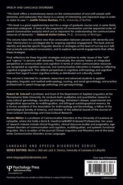 This volume takes the positive view that conversation between persons with dementia and their interlocutors is a privileged site for ongoing cognitive engagement. The book aims to identify and describe specific linguistic devices or strategies at the level of turn-by-turn talk that promote and extend conversation, and to explore real-world engagements that reflect these strategies. Final reflections tie these linguistic strategies and practices to wider issues of the "self" and "agency" in persons with dementia. Thematically, the volume fosters an integrated perspective on communication and cognition in terms of which communicative resources are recognized as cognitive resources, and communicative interaction is treated as reflecting cognitive engagement. This reflects perspectives in cognitive anthropology and cognitive science that regard human cognitive activity as distributed and culturally rooted. This volume is intended for academic researchers and advanced students in applied linguistics, linguistic and medical anthropology, nursing, and social gerontology; and practice professionals in speech-language pathology and geropsychology.