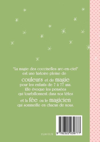 "La magie des coccinelles arc-en-ciel" c'est le récit d'une renaissance. Celle de Françoise qui, après une profonde dépression, dévoile le pouvoir magique de nos pensées.Françoise offre aux personnes en butte au désespoir son témoignage qui redonne courage et compassion. C'est une invitation à changer sa vie en réponse à l'appel au secours d'une âme en souffrance.Avec des illustrations pleines de couleurs et un dialogue simple, le lecteur se retrouve plongé dans un univers magique qui lui permet de retrouver la fée ou le magicien qui sommeille en lui.Les petits comme les grands y trouveront leur bonheur.Laissez-vous enchanter!