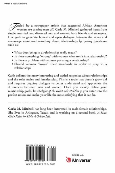 Fueled by a newspaper article that suggested African American women are scaring men off, Carla M. Mitchell gathered input from single, married, and divorced men and women, both friends and strangers. Her goal: to generate honest and open dialogue between the sexes and encourage more soul searching about relationships by posing questions, such as: What does being in a relationship really mean? Is there something "wrong" with women who aren't in a relationship? Is there a problem with women pursuing a relationship? Should women "lower" their standards in order to stay in a relationship? Carla collates the many interesting and varied responses about relationships and the roles males and females play. This is a topic that doesn't grow old and requires ongoing dialogue to better understand and appreciate the differences between men and women. Once you clearly define your relationship goals, let Dialogue of the Heart and Mind help you enter into the perfect union and make your life the most satisfying that it can be.