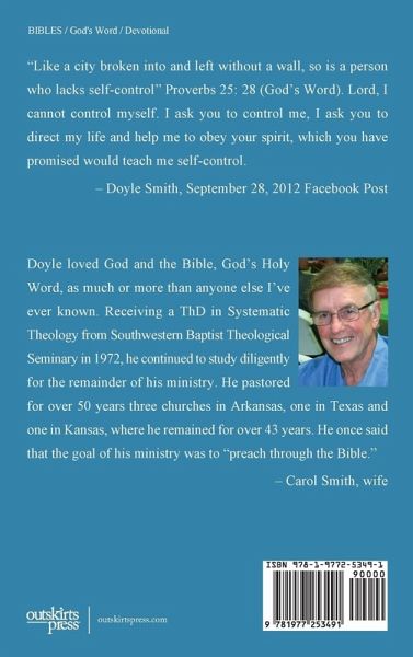 "Like a city broken into and left without a wall, so is a person who lacks self-control" Proverbs 25: 28 (God's Word). Lord, I cannot control myself. I ask you to control me, I ask you to direct my life and help me to obey your spirit, which you have promised would teach me self-control. - Doyle Smith, September 28, 2012 Facebook Post