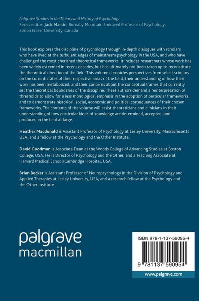 This book explores the discipline of psychology through in-depth dialogues with scholars who have lived at the turbulent edges of mainstream psychology in the USA, and who have challenged the most cherished theoretical frameworks. It includes researchers whose work has been widely esteemed in recent decades, but has ultimately not been taken up to reconstitute the theoretical direction of the field. This volume chronicles perspectives from select scholars on the current states of their respective areas of the field, their understanding of how their work has been metabolized, and their concerns about the conceptual frames that currently set the theoretical boundaries of the discipline. These authors demand a reinterpretation of thresholds to allow for a less monological emphasis in the adoption of particular frameworks, and to demonstrate historical, social, economic and political consequences of their chosen frameworks. The contents of the volume will assist theoreticians and clinicians in their understanding of how particular kinds of knowledge are determined, accepted, and produced in the field at large.