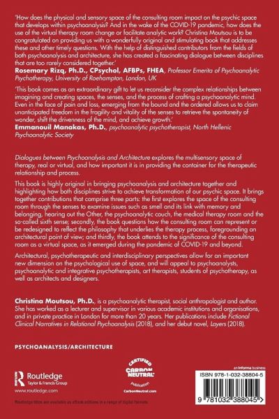 Introduction Part One: The Relational Space of the Consulting Room Through the Senses 1. In the Beginning is Smell: The Sense of Belonging and Remembering and the Impact of its Loss in Psychotherapy 2. Hearing Other Voices: The Ear as the Eye of Invisible Class Discrimination 3. Touching Nostalgia and Regret When Lying to Tell the Truth on the Couch 4. The Therapy Consulting Room in a Medical Setting as Experienced Through the Senses 5. Unfurling Ariadne's Thread: Psychic Connections and the Engagement of the 'Sixth Sense' in the Consulting Room Part Two: Dialogues Between Architecture and Psychoanalysis 6. On the Architect's Couch: Elective Affinities Between Architecture and Psychoanalysis 7. Dialogues Between Architecture and Psychotherapy: Revisiting Four Consulting Rooms Part Three: The Online Consulting Room During the COVID-19 Pandemic and Beyond 8. The Screen Therapy Room: Real Flowers in a Digital Vase 9. Sensual Deprivation and Therapy During the Covid-19 Pandemic 10. Observing and Consulting in Digital Aquariums