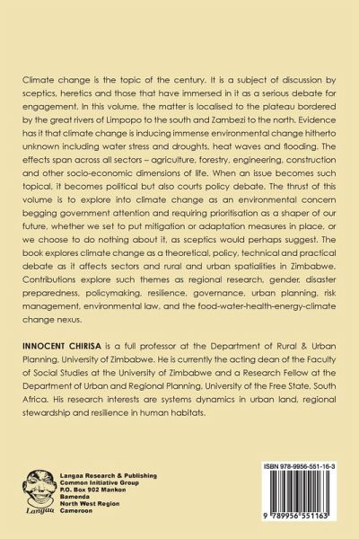 Climate change is the topic of the century. It is a subject of discussion by sceptics, heretics and those that have immersed in it as a serious debate for engagement. In this volume, the matter is localised to the plateau bordered by the great rivers of Limpopo to the south and Zambezi to the north. Evidence has it that climate change is inducing immense environmental change hitherto unknown including water stress and droughts, heat waves and flooding. The effects span across all sectors - agriculture, forestry, engineering, construction and other socio-economic dimensions of life. When an issue becomes such topical, it becomes political but also courts policy debate. The thrust of this volume is to explore into climate change as an environmental concern begging government attention and requiring prioritisation as a shaper of our future, whether we set to put mitigation or adaptation measures in place, or we choose to do nothing about it, as sceptics would perhaps suggest. The book explores climate change as a theoretical, policy, technical and practical debate as it affects sectors and rural and urban spatialities in Zimbabwe. Contributions explore such themes as regional research, gender, disaster preparedness, policymaking, resilience, governance, urban planning, risk management, environmental law, and the food-water-health-energy-climate change nexus.