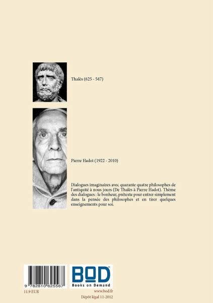 Dialogues imaginaires avec quarante quatre philosophes de l'antiquité à nous jours (De Thalès à Pierre Hadot). Thème des dialogues : le bonheur, prétexte pour entrer simplement dans la pensée des philosophes et en tirer quelques enseignements pour soi.