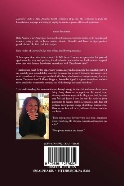 About the Book Diamond Chips is Billie Annette's fourth collection of poetry. She continues to push the boundaries of language and thought, urging the reader to pause, reflect, and appreciate. About the Author Billie Annette is an Ojibwe poet from northern Minnesota. She looks to find joy in each day and treasures being a wife to James, mother, Auntie, "Auntch", and Nana to eight precious grandchildren. Her fifth book is in progress. Early readers of Diamond Chips have offered the following reactions: "I have spent time with these poems. I LOVE them. They are so open ended for personal application that they work perfectly for self-reflection and meditation. I will continue to spend more time with them as they deserve more than a read. They deserve time!" "Thank you so much for the opportunity to read, enjoy and contemplate this beautiful poetry. I am struck by your natural ability to remind the reader that we aren't limited to five senses...each word reminds us of the energy associated with them, which creates a unique memory for each reader. The poem titled "I Almost Forgot to Remember Again" is a gentle reminder to embrace those details that re-create the memory and all the feelings associated with them." "The understanding that communication through energy is powerful and comes from every living thing allows us to experience the world more vibrantly and more respectfully. Hug a tree limb, become that fool and know. I love the way the reader is given permission to become that fool, because society does not embrace the important energy of all things that have life. Once we do, there will be very different decisions made by the Seven. "I love these poems; they move me each time I experience them. They bring life, vibrancy, curiosity and lessons to my spirit." "Your poems are true and honest."