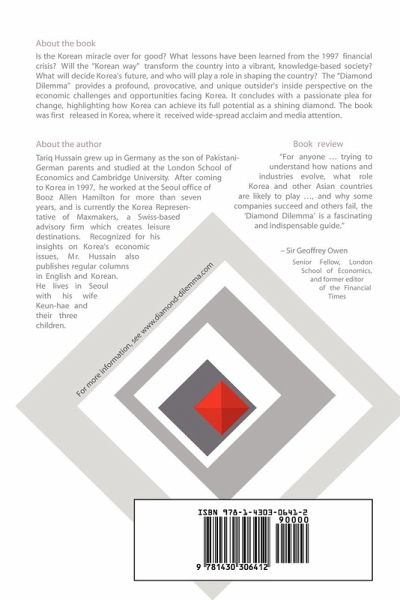 The "Diamond Dilemma" provides a profound, provocative, and unique outsider's inside perspective on the challenges and opportunities facing South Korea. It concludes with a passionate plea for change, highlighting how the country can achieve its full potential as a shining diamond. The book received wide-spread acclaim and media attention in Korea, where it was released by Random House Joongang. The English version is now available on Lulu. "For anyone ... trying to understand how nations and industries evolve, what role Korea and other Asian countries are likely to play ..., and why some companies succeed and others fail, the 'Diamond Dilemma' is a fascinating and indispensable guide." Sir Geoffrey Owen, Senior Fellow, London School of Economics, and former editor of the Financial Times