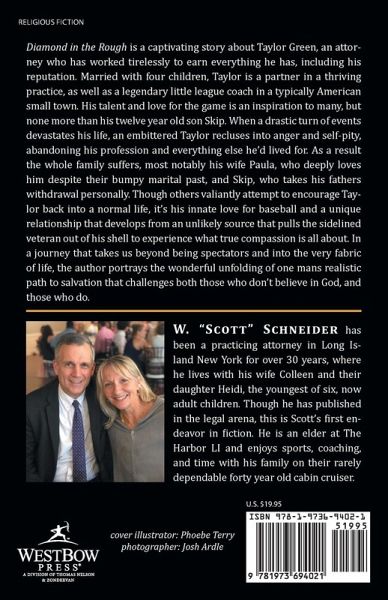 Diamond in the Rough is a captivating story about Taylor Green, an attorney who has worked tirelessly to earn everything he has, including his reputation. Married with four children, Taylor is a partner in a thriving practice, as well as a legendary little league coach in a typically American small town. His talent and love for the game is an inspiration to many, but none more than his twelve year old son Skip. When a drastic turn of events devastates his life, an embittered Taylor recluses into anger and self-pity, abandoning his profession and everything else he'd lived for. As a result the whole family suffers, most notably his wife Paula, who deeply loves him despite their bumpy marital past, and Skip, who takes his fathers withdrawal personally. Though others valiantly attempt to encourage Taylor back into a normal life, it's his innate love for baseball and a unique relationship that develops from an unlikely source that pulls the sidelined veteran out of his shell to experience what true compassion is all about. In a journey that takes us beyond being spectators and into the very fabric of life, the author portrays the wonderful unfolding of one mans realistic path to salvation that challenges both those who don't believe in God, and those who do.