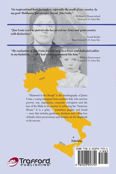 Diamond In The Rough is an autobiography of James M. Costa, a young immigrant from S. Italy who survives poverty, war, amputation, corporate corruption and the lure of the Mafia in his journey to achieving the "American Dream". It is a gritty, sometimes graphic and brutal story that includes gentleness, kindness, and deep love of family, where perseverance and integrity are the shepherds to his success.