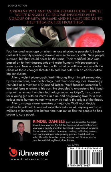 Four hundred years ago an alien menace attacked a peaceful US colony and sent humanity speeding down a new evolutionary path. Nine people survived, but they would never be the same. Their modified DNA was passed on to their descendants and meta-humans with superpowers were born. Now a reluctant hero is thrust into a collision course with the aliens as those changes threaten to end that path with an earth-shattering conclusion. After a violent plane crash, Wolff Kingsley finds himself surrounded by meta-humans, alien technology, and mind-bending foes. Unwillingly recruited as a member of Diamond Justice, Wolff faces an uncertain future and fears a return to his past. He struggles to understand his friendship with a remnant of alien technology known as Glip-2, his concern for a young girl with an interest in him, and his growing love for a mysterious meta-human woman who may be tied to the origin of the threat. After a strange storm terrorizes a major city, Wolff must decide whether he will help Diamond solve the centuries old mystery and save millions of innocent lives before time runs out or flee the people he has grown to care about.