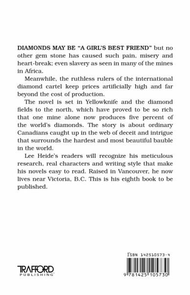 The novel is set in Yellowknife in 1995, and the diamond fields to the north. Exploration is a fever pitch. It features an airline pilot who finds a rich diamond lode and then runs into trouble with the International Keamond cartel.