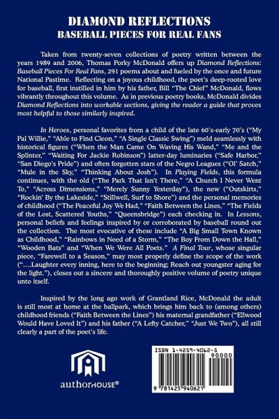Taken from twenty-seven collections of poetry written between the years 1989 and 2006, Thomas Porky McDonald offers up Diamond Reflections: Baseball Pieces For Real Fans, 291 poems about and fueled by the once and future National Pastime. Reflecting on a joyous childhood, the poet's deep-rooted love for baseball, first instilled in him by his father, Bill "The Chief" McDonald, flows vibrantly throughout this volume. As in previous poetry books, McDonald divides Diamond Reflections into workable sections, giving the reader a guide that proves most helpful to those similarly inspired. In Heroes, personal favorites from a child of the late 60's-early 70's ("My Pal Willie," "Able to Find Cleon," "A Single Classic Swing") meld seamlessly with historical figures ("When the Man Came On Waving His Wand," "Me and the Splinter," "Waiting For Jackie Robinson") latter-day luminaries ("Safe Harbor," "San Diego's Pride") and often forgotten stars of the Negro Leagues ("Ol' Satch," "Mule in the Sky," "Thinking About Josh"). In Playing Fields, this formula continues, with the old ("The Park That Isn't There," "A Church I Never Went To," "Across Dimensions," "Merely Sunny Yesterday"), the new ("Outskirts," "Rockin' By the Lakeside," "Stillwell, Surf to Shore") and the personal memories of childhood ("The Peaceful Joy We Had," "Faith Between the Lines," "The Fields of the Lost, Scattered Youths," "Queensbridge") each checking in. In Lessons, personal beliefs and feelings inspired by or corroborated by baseball round out the collection. The most evocative of these include "A Big Small Town Known as Childhood," "Rainbows in Need of a Storm," "The Boy From Down the Hall," "Wooden Bats" and "When We Were All Poets." A Final Tour, whose singular piece, "Farewell to a Season," may most properly define the scope of the work ("..Laughter every inning, here to the beginning; Reach out youngster aging for the light."), closes out a sincere and thoroughly positive volume of