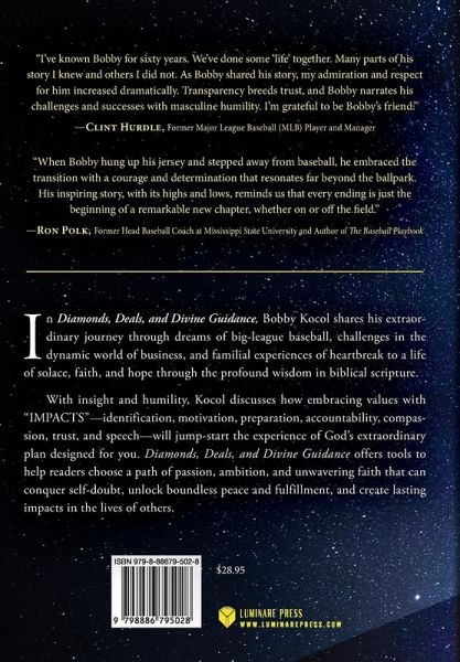 In Diamonds, Deals, and Divine Guidance, Bobby Kocol shares his extraordinary journey through dreams of big-league baseball, challenges in the dynamic world of business, and familial experiences of heartbreak to a life of solace, faith, and hope through the profound wisdom in biblical scripture. With insight and humility, Kocol discusses how embracing values with "IMPACTS"-identification, motivation, preparation, accountability, compassion, trust, and speech-will jump-start the experience of God's extraordinary plan designed for you. Diamonds, Deals, and Divine Guidance offers tools to help readers choose a path of passion, ambition, and unwavering faith that can conquer self-doubt, unlock boundless peace and fulfillment, and create lasting impacts in the lives of others. Immerse yourself in these character-building principles and foster positive change in your life. March forward with confidence, fortified by steadfast resilience. Let these timeless precepts, shaped by divine guidance, navigate you through life's storms and propel you toward freedom and self-fulfillment.