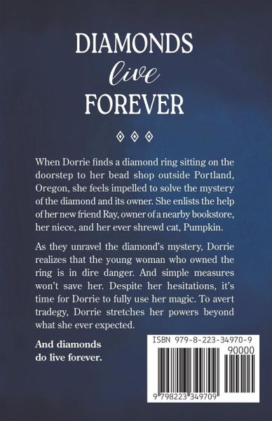 When Dorrie finds a diamond ring sitting on the doorstep to her bead shop outside Portland, Oregon, she feels impelled to solve the mystery of the diamond and its owner. She enlists the help of her new friend Ray, owner of a nearby bookstore, her niece, and her ever shrewd cat Pumpkin. As they unravel the diamond's mystery, Dorrie realizes that the young woman who owned the ring is in dire danger. And simple measures won't save her. Despite her hesitations, it's time for Dorrie to fully use her magic.. To avert tragedy, Dorrie stretches her powers beyond what she ever expected. And diamonds do live forever.
