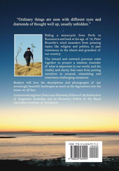 "Ordinary things are seen with different eyes and diamonds of thought well up, usually unbidden." Riding a motorcycle from Perth to Kununurra and back at the age of 72, Peter Bruechle's mind meanders from pressing topics like religion and politics, to past reminisces, to the charm and grandeur of our country.The inward and outward journeys come together to present a timeless reminder of what is important in our world, and the vitality and clarity that come from putting ourselves in unusual, stimulating and sometimes challenging situations.Readers will love the descriptions and photographs of our arrestingly beautiful landscapes as much as the digressions into the issues we all face.