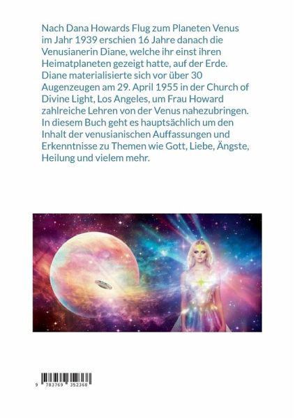 Nach Dana Howards Flug zum Planeten Venus im Jahr 1939 erschien 16 Jahre danach die Venusianerin Diane, welche ihr einst ihren Heimatplaneten gezeigt hatte, auf der Erde. Diane materialisierte sich vor über 30 Augenzeugen am 29. April 1955 in der Church of Divine Light, Los Angeles, um Frau Howard zahlreiche Lehren von der Venus nahezubringen. In diesem Buch geht es hauptsächlich um den Inhalt der venusianischen Auffassungen und Erkenntnisse zu Themen wie Gott, Liebe, Ängste, Heilung und vielem mehr.