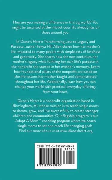 In Diane's Heart: Transforming Loss to Legacy and Purpose, author Tonya Hill Allen shares how her mother's life impacted so many people with simple acts of kindness and generosity. She shares how she now continues her mother's legacy while fulfilling her own life's purpose in the nonprofit she started in her mother's memory. Learn how foundational pillars of the nonprofit are based on the life lessons her mother taught and demonstrated throughout her life. Additionally, learn how you can change your world with practical, everyday offerings from your heart.