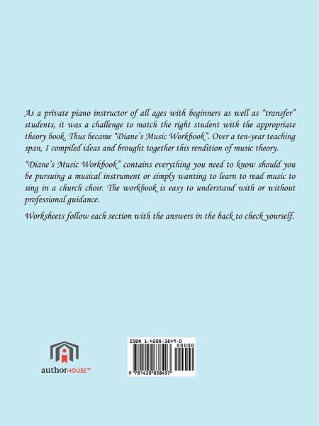As a private piano instructor of all ages with beginners as well as "transfer" students, it was a challenge to match the right student with the appropriate theory book. Thus became "Diane's Music Workbook". Over a ten-year teaching span, I compiled ideas and brought together this rendition of music theory. "Diane's Music Workbook" contains everything you need to know should you be pursuing a musical instrument or simply wanting to learn to read music to sing in a church choir. The workbook is easy to understand with or without professional guidance. Worksheets follow each section with the answers in the back to check yourself.