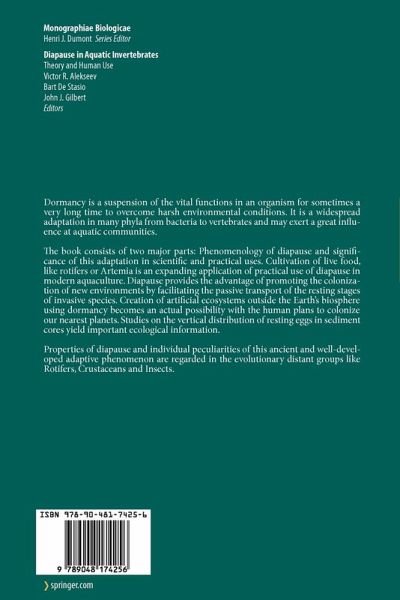 Contributors to this new book are leaders in the field of diapause studies, and many authors were participants at a recent workshop on diapause in aquatic invertebrates (Pallanza, Italy 2003). The book consists of two major parts, as indicated in its title: Phenomenology of diapause and significance of this adaptation in scientific and practical uses. Application to newly developing areas such as cultivation of live food, like rotifers or Artemia, in modern aquaculture is covered, as are aspects of diapause that promote the colonization of new environments by facilitating the passive transport of resting stages of invasive species. Creation of artificial ecosystems outside of the Earth's biosphere using dormant propagules becomes an actual possibility as humankind develops plans to colonize our nearest planets. Also, studies on the vertical distribution of resting stages in undisturbed sediment cores yield important ecological and evolutionary information useful in investigations of past environments.
