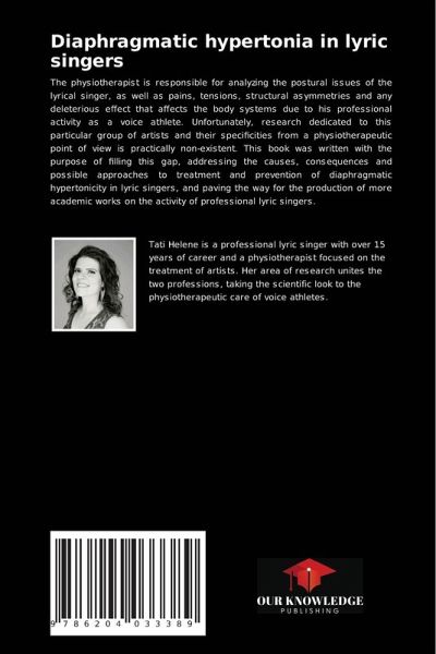 The physiotherapist is responsible for analyzing the postural issues of the lyrical singer, as well as pains, tensions, structural asymmetries and any deleterious effect that affects the body systems due to his professional activity as a voice athlete. Unfortunately, research dedicated to this particular group of artists and their specificities from a physiotherapeutic point of view is practically non-existent. This book was written with the purpose of filling this gap, addressing the causes, consequences and possible approaches to treatment and prevention of diaphragmatic hypertonicity in lyric singers, and paving the way for the production of more academic works on the activity of professional lyric singers.