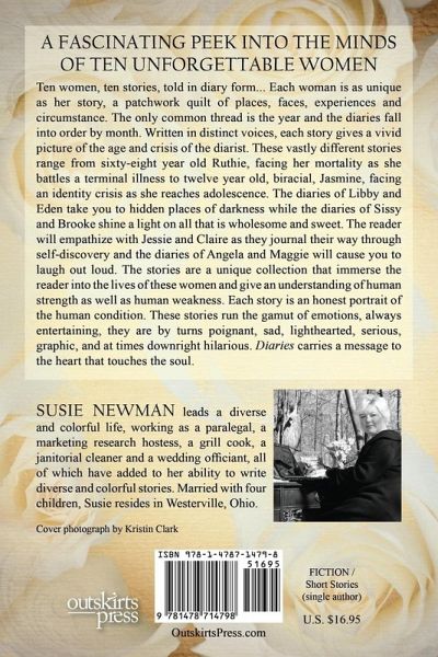 Diaries is a unique and inspiring collection of ten short stories. The stories are titled with the diarist's first name, and they fall into order by month, moving and changing like the seasons. Written in distinct voices, Diaries is a collection of life, love, laughter, death, innocence and triumph. The stories make up a richly layered tapestry, woven with tales of human strength and tales of human weakness. Each story is an honest portrait and look into the human condition. The diaries are a mixture of heartbreak and wit told through clear and honest voices. At times the stories are raw and visceral and at other times they are lighthearted with comic timing. The first story, "Ruthie" is the journal of a dying woman. Ruthie is a sixty-eight year old housewife, mother, grandmother, and gardener extraordinaire. Ruthie faces her mortality and records her final days with courage and comfort. Her diary gives the reader a spiritual insight gifted from a simple and humble woman. The razor sharp memoir of "Libby" is both tender and piercing and takes the reader to hidden places of darkness. "Angela" is a journal of monthly postings, a charming anecdote, delightfully amusing. The diary of "Brooke" is a letter from a teen mom to her premature, infant son, and it is written with the innocence and hope that only an eighteen year old mommy can muster. "Jasmine" is the journal of a biracial, twelve year old at the beginning of summer. Her journal gives to the reader a child's view on diversity, racism and intolerance. The readers of Diaries will cheer on "Sissy" as she survives her abandonment and heartbreak with three kids, a free spirit, and bare feet. "Eden" is a diary wrought with heartache. Her raw history of abuse and neglect is written in lyric beauty that will move the reader to tears. The diary of "Claire" will transport the reader to an autumn day that is October lush, bright orange and golden. "Jessie" is the journal of the imper