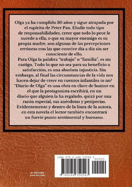 Olga ha cumplido 30 años y sigue atrapada por el espíritu de Peter Pan. Eludir todo tipo de responsabilidades, creer que todo lo peor le sucede a ella, o que su mayor enemigo es su propia madre, son algunas de las percepciones erróneas con las que convive día a día sin ser consciente de ello. Para Olga la palabra "trabajo" o "familia", es un castigo. Todo lo que no sea para su beneficio o satisfacción, es una absoluta injusticia. Sin embargo, al final las circunstancias de la vida nos hacen dejar de creer en cuentos infantiles ¿o no? "Diario de Olga" es una obra en clave de humor en el que la protagonista escribirá, en un diario que alguien la ha regalado, quizá por una razón especial, sus anécdotas y peripecias. Evidentemente y dentro de la línea de la autora, en esta novela el lector también encontrará un fuerte punto sentimental y humano.