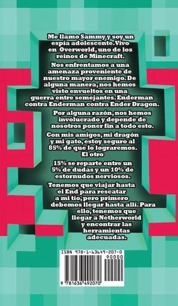 Me llamo Sammy y soy un espía adolescente. Vivo en Overworld, uno de los reinos de Minecraft. Nos enfrentamos a una amenaza proveniente de nuestro mayor enemigo. De alguna manera, nos hemos visto envueltos en una guerra entre semejantes. Enderman contra Enderman contra Ender Dragon. Por alguna razón, nos hemos involucrado y depende de nosotros poner fin a todo esto. Con mis amigos, mi dragón y mi gato, estoy seguro al 85% de que lo lograremos. El otro 15% se reparte entre un 5% de dudas y un 10% de estornudos nerviosos. Tenemos que viajar hasta el End para rescatar a mi tío, pero primero debemos llegar hasta allí. Para ello, tenemos que llegar a Netherworld y encontrar las herramientas adecuadas. Espero que no lleguemos demasiado tarde para salvar a mi tío y que los pedos de fuego de Nocte no nos metan en problemas. ¡Toca madera! Este libro no es un producto oficial de Minecraft y no ha sido aprobado por ni está asociado a Mojang. El Autor, Sammy Spy, CAT Publishing International y Caroline Treanor International Books no son Mojang y no están asociados a Mojang ni financiados por Mojang.