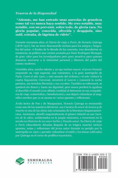 Tesoros de la Hispanidad "Además, me han entrado unas aureolas de grandeza como tal vez nunca haya sentido. Me creo notable, muy notable, con un porvenir, sobre todo, de gloria rara. No gloria popular, conocida, ofrecida y desgajada, sino sutil, extraña, de lágrima de vidrio". Durante cincuenta años, el Diario de viaje a París, de Horacio Quiroga (1878-1937), fue un texto desconocido incluso para los amigos y biógrafos del autor. A finales de la década de los cuarenta, tras descubrirse su existencia, se publicó una versión anotada por Emir Rodríguez Monegal, de gran valor para los investigadores pero poco atractiva para quienes desearan acercarse a la intimidad personal y literaria del padre del cuento moderno. Veintidós años, mucho talento y un ego incluso mayor, el joven Horacio emprende un viaje especial, casi romántico, a la gran metrópolis de París. Corre el año 1900, y este amante del ciclismo y el arte visitará la cuarta Exposición Universal, recorrerá el Louvre y conocerá la noche parisina, sus tertulias literarias y sus cocottes. También se enfermará, se quedará sin dinero y hasta sin dignidad, pero nunca perderá la agudeza al describir el mundo (con afilada crueldad al detenerse en sus compañeros de viaje, contertulios y benefactores) y nos dejará vislumbrar al magnífico escritor que ya se asoma en varios apuntes y reflexiones. Ávido lector de Poe y de Maupassant, Horacio Quiroga es reconocido como uno de los maestros del terror, sus Cuentos de amor de locura y de muerte es una de las obras más aclamadas de la literatura hispanoamericana. Asimismo, abordó magistralmente el género infantil en sus Cuentos de la selva, ambientados en la jungla misionera, e incursionó en la novela en Historia de un amor turbio y Pasado amor. Su Diario de viaje a París (descubierto décadas después de su trágica muerte) incluye apuntes, notas y reflexiones del joven autor durante su periplo por la metrópolis en 1900 y permite vislumbrar el estilo y los temas cultivados por Quiroga en el curso de prolífica trayectoria. Twenty-two years, a formidable talent and a matching ego, Horacio Quiroga (1878-1937) disembarks in Paris in the summer of 1900. He will visit the Louvre and the fourth Universal Exhibition, watch bicycle races, take part in literary circles and meet the famous Parisian cocottes. He will also get sick, run out of money (and even dignity), in an almost romantic adventure that will mark him forever. The uncontested master of modern Latin American narrative, Quiroga draws his influences from modernist giants, such as Rubén Darío, and romantic and naturalist behemoths, such as Edgar Allan Poe and Guy de Maupassant. Cuentos de amor de locura y de muerte, his most acclaimed work, includes "La gallina degollada" and "El amohadón de plumas", classics of Spanish horror literature.