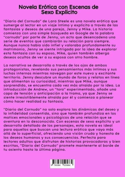 "Diario del Cornudo" de Lara Steele es una novela erótica que sumerge al lector en un viaje íntimo y explícito a través de las fantasías y deseos de una pareja, Jenny y Mike. La historia comienza con una simple búsqueda en Google de la palabra "cornudo" por parte de Jenny, un acto que desencadena una serie de eventos que cambiarán su relación para siempre. Aunque nunca había sido infiel y valoraba profundamente su matrimonio, Jenny se siente intrigada por la idea de explorar esta fantasía con su esposo, Mike, quien también alberga deseos ocultos de ver a su esposa con otro hombre.La narrativa se desarrolla a través de los ojos de ambos protagonistas, revelando sus pensamientos más íntimos y sus luchas internas mientras navegan por este nuevo y excitante territorio. Jenny descubre un mundo de foros y relatos en línea que alimentan su curiosidad, mientras que Mike, aunque sorprendido, se encuentra cada vez más atraído por la idea. La introducción de Andrew, un "toro" experimentado,añade una capa de tensión y anticipación a la trama, ya que Jenny se siente irresistiblemente atraída por él y comienza a planear cómo hacer realidad su fantasía."Diario del Cornudo" no solo explora las dinámicas del deseo y la infidelidad consentida, sino que también profundiza en los matices emocionales y psicológicos de una relación que se aventura en lo desconocido. Con escenas de sexo explícito y un desarrollo detallado de los personajes, esta novela es ideal para aquellos que buscan una lectura erótica que vaya más allá de lo superficial, ofreciendo una visión cruda y honesta de los deseos humanos y sus consecuencias. Perfecta para lectores adultos que disfrutan de historias provocadoras y bien escritas, "Diario del Cornudo" promete mantenerte al borde de tu asiento hasta la última página.