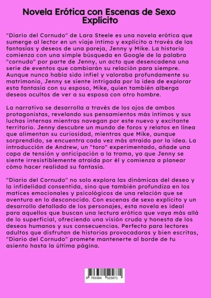 "Diario del Cornudo" de Lara Steele es una novela erótica que sumerge al lector en un viaje íntimo y explícito a través de las fantasías y deseos de una pareja, Jenny y Mike. La historia comienza con una simple búsqueda en Google de la palabra "cornudo" por parte de Jenny, un acto que desencadena una serie de eventos que cambiarán su relación para siempre. Aunque nunca había sido infiel y valoraba profundamente su matrimonio, Jenny se siente intrigada por la idea de explorar esta fantasía con su esposo, Mike, quien también alberga deseos ocultos de ver a su esposa con otro hombre.La narrativa se desarrolla a través de los ojos de ambos protagonistas, revelando sus pensamientos más íntimos y sus luchas internas mientras navegan por este nuevo y excitante territorio. Jenny descubre un mundo de foros y relatos en línea que alimentan su curiosidad, mientras que Mike, aunque sorprendido, se encuentra cada vez más atraído por la idea. La introducción de Andrew, un "toro" experimentado,añade una capa de tensión y anticipación a la trama, ya que Jenny se siente irresistiblemente atraída por él y comienza a planear cómo hacer realidad su fantasía."Diario del Cornudo" no solo explora las dinámicas del deseo y la infidelidad consentida, sino que también profundiza en los matices emocionales y psicológicos de una relación que se aventura en lo desconocido. Con escenas de sexo explícito y un desarrollo detallado de los personajes, esta novela es ideal para aquellos que buscan una lectura erótica que vaya más allá de lo superficial, ofreciendo una visión cruda y honesta de los deseos humanos y sus consecuencias. Perfecta para lectores adultos que disfrutan de historias provocadoras y bien escritas, "Diario del Cornudo" promete mantenerte al borde de tu asiento hasta la última página.