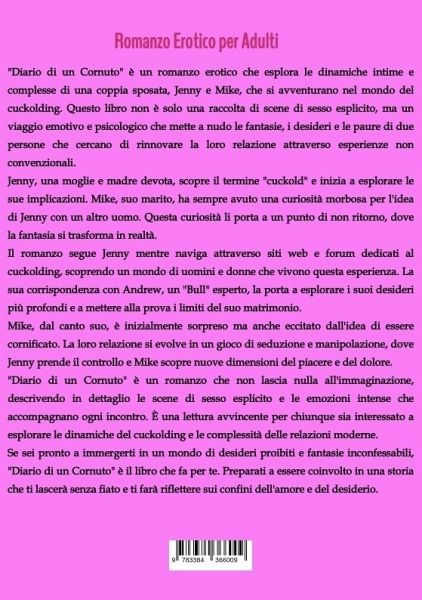 "Diario di un Cornuto" è un romanzo erotico che esplora le dinamiche intime e complesse di una coppia sposata, Jenny e Mike, che si avventurano nel mondo del cuckolding. Questo libro non è solo una raccolta di scene di sesso esplicito, ma un viaggio emotivo e psicologico che mette a nudo le fantasie, i desideri e le paure di due persone che cercano di rinnovare la loro relazione attraverso esperienze non convenzionali.Jenny, una moglie e madre devota, scopre il termine "cuckold" e inizia a esplorare le sue implicazioni. Mike, suo marito, ha sempre avuto una curiosità morbosa per l'idea di Jenny con un altro uomo. Questa curiosità li porta a un punto di non ritorno, dove la fantasia si trasforma in realtà.Il romanzo segue Jenny mentre naviga attraverso siti web e forum dedicati al cuckolding, scoprendo un mondo di uomini e donne che vivono questa esperienza. La sua corrispondenza con Andrew, un "Bull" esperto, la porta a esplorare i suoi desideri più profondi e a mettere alla prova i limiti del suo matrimonio.Mike, dal canto suo, è inizialmente sorpreso ma anche eccitato dall'idea di essere cornificato. La loro relazione si evolve in un gioco di seduzione e manipolazione, dove Jenny prende il controllo e Mike scopre nuove dimensioni del piacere e del dolore."Diario di un Cornuto" è un romanzo che non lascia nulla all'immaginazione, descrivendo in dettaglio le scene di sesso esplicito e le emozioni intense che accompagnano ogni incontro. È una lettura avvincente per chiunque sia interessato a esplorare le dinamiche del cuckolding e le complessità delle relazioni moderne.Se sei pronto a immergerti in un mondo di desideri proibiti e fantasie inconfessabili, "Diario di un Cornuto" è il libro che fa per te. Preparati a essere coinvolto in una storia che ti lascerà senza fiato e ti farà riflettere sui confini dell'amore e del desiderio.